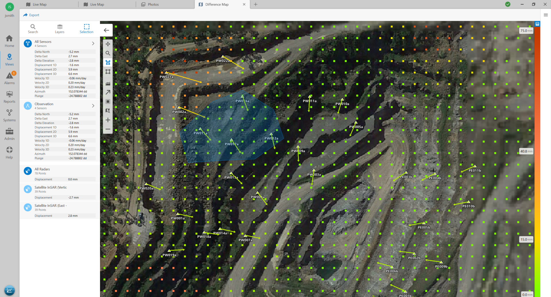 Difference Maps | Unique ability to select and compare data from different sources and instruments including overlaying measurements and comparing InSAR data |