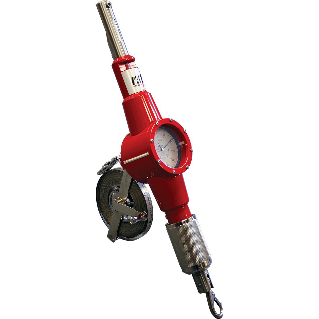 The instrument consists of a precision punched steel tape incorporating a repeatable tensioning system and dial gauge readout. To obtain a reading, the swivel hook, on the fixed end of the extensometer, is connected to the stainless steel eye on the anchor. The tape is unwound, allowing the tape swivel hook to be attached to the opposing anchor eye. Coarse tension adjustment is accomplished by positioning the pin of the extensometer in one of the precision punched tape holes. Fine tension adjustment is by rotating a knurled sleeve until two index marks align. A precision dial gauge measures this fine adjustment, with the tape held under a consistent repeatable spring force. The instrument is then read by noting the tape position, and subtracting the dial gauge reading.